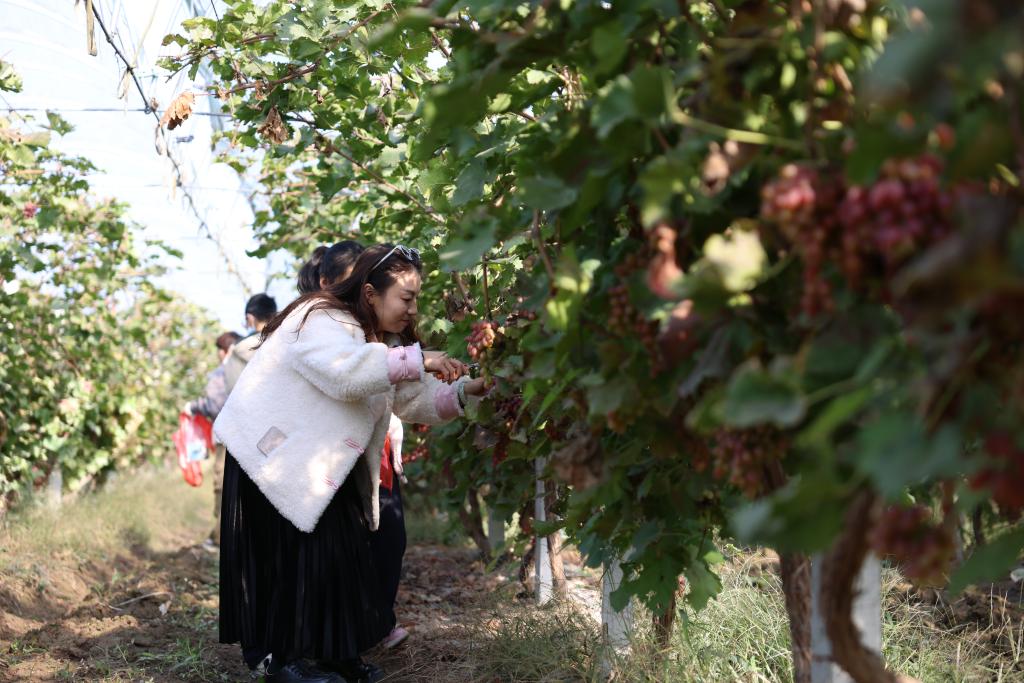 游客在新河县刘秋口村富硒“克瑞森”葡萄产业园采摘葡萄。新华社发(李世强 摄)