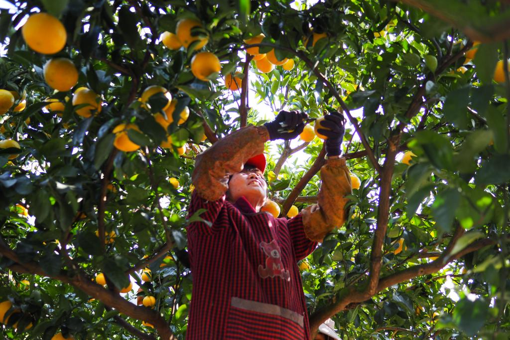 浙江省庆元县竹口镇黄坛水干果园区内,工人在采摘甜桔柚。 新华社记者 刘梓漪 摄